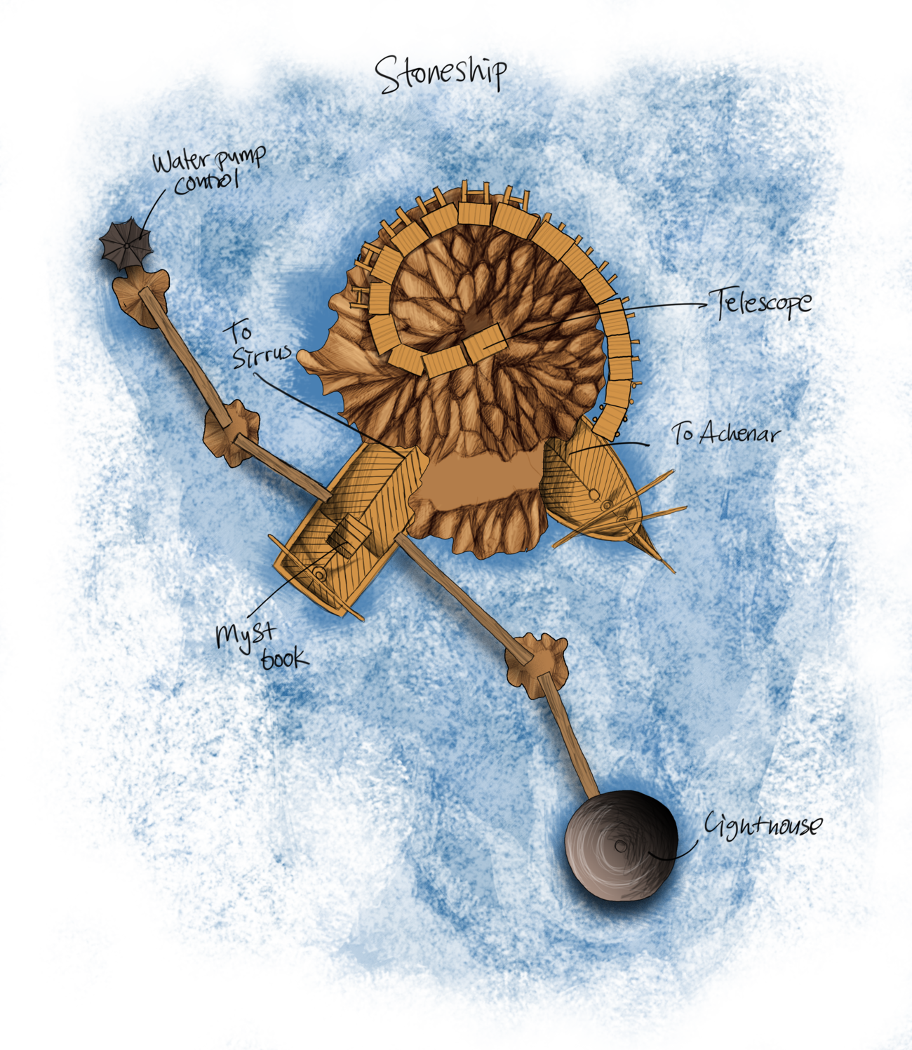 This age seems as small as Mechanical Age, but is even more weird... There is a huge ship that’s wedged solid into a huge rock, and at a weird angle. Hard to explain... I’ll draw a map of this place. Each “side” of the boat has an entrance, and there is an entrance in the back of the boat as well. In the house there is a generator (after you’ve found the key, which was an ordeal ) that you can turn to generate power, and then direct the power to each door with the switches. At the top of the rock is a small telescope but the thick mist makes it impossible to see anything. The entrance down the boat is pitch black and I don’t want to fumble around in the dark, so I focused on the other entrances first. Both leads down to rooms belonging to Achenar and Sirrus respectively. Both rooms are beautiful in their own right. Sirrus’ room is luxurious while Achenar’s is more brutal.