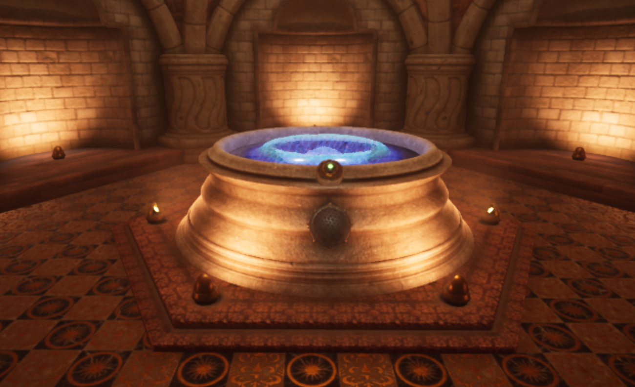 Outside the tree border, there is a small island with a windmill on it. Inside there was a large water tank and a valve. After turning the valve, I can hear the sound of water running inside the pipes. At a lot of walkway crossings there is a valve to let the water flow in either direction. The water in turn powers different machines that gives power to an elevator for instance.